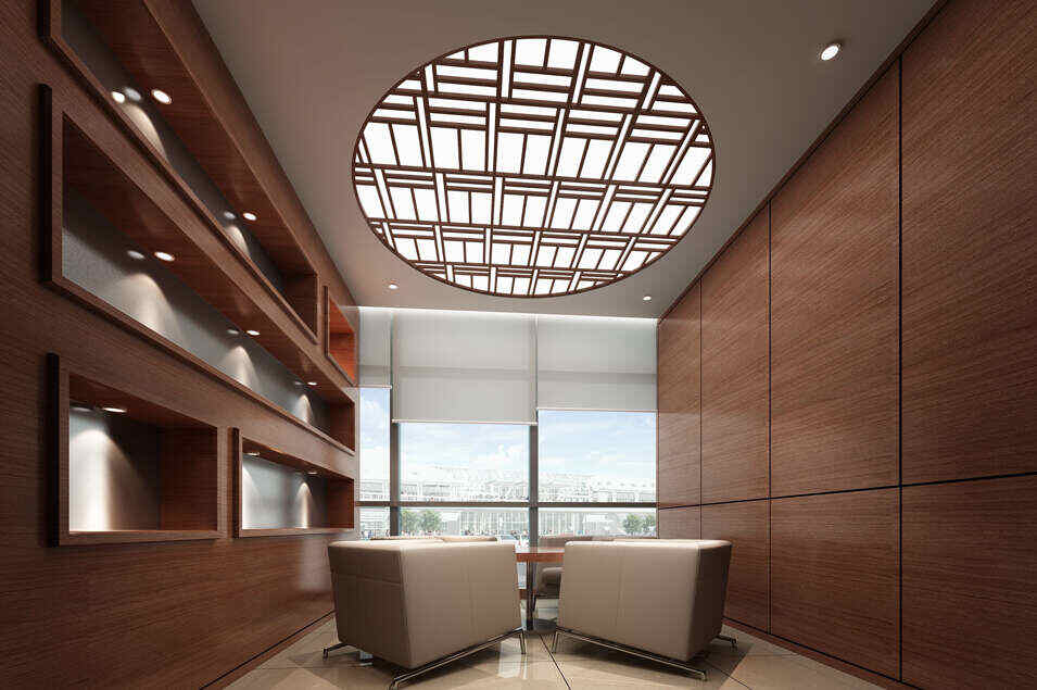 設(shè)計介紹:現(xiàn)代簡約凝重風(fēng)如何展現(xiàn)?設(shè)計師們運用棕色的色調(diào)表現(xiàn)出凝重感,頂部圓形中國風(fēng)網(wǎng)狀帶有悠久的中國藝術(shù),天圓地方設(shè)計,使人一進(jìn)入到這個辦公室給人與專業(yè)、理性的感覺,這點特別符合公司的企業(yè)文化。