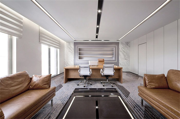 董事長辦公室設計時最好靠實墻,給人一種穩定、安全感,我們中國人的說法代表背有靠山。視野朝向最好開闊,距離門要相對遠一點,也要避開頂梁特別明線的位置。方位朝向以坐北朝南,坐東朝西兩個方位最好。
