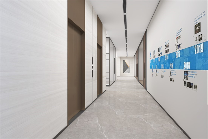 ▌走廊的背景是灰色的彩繪玻璃,頂部細長的燈帶增加了深度感。